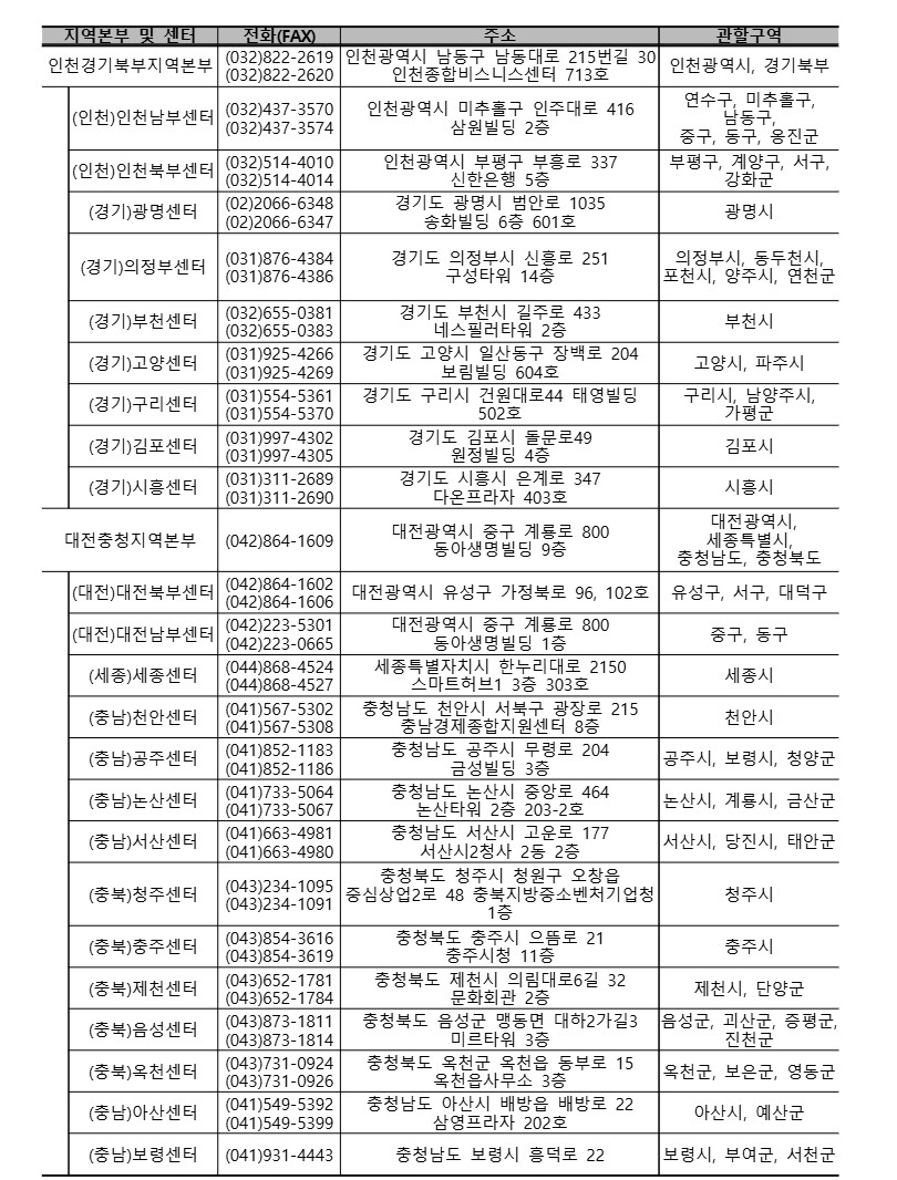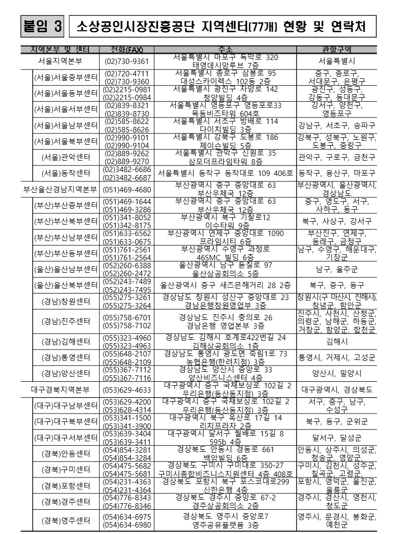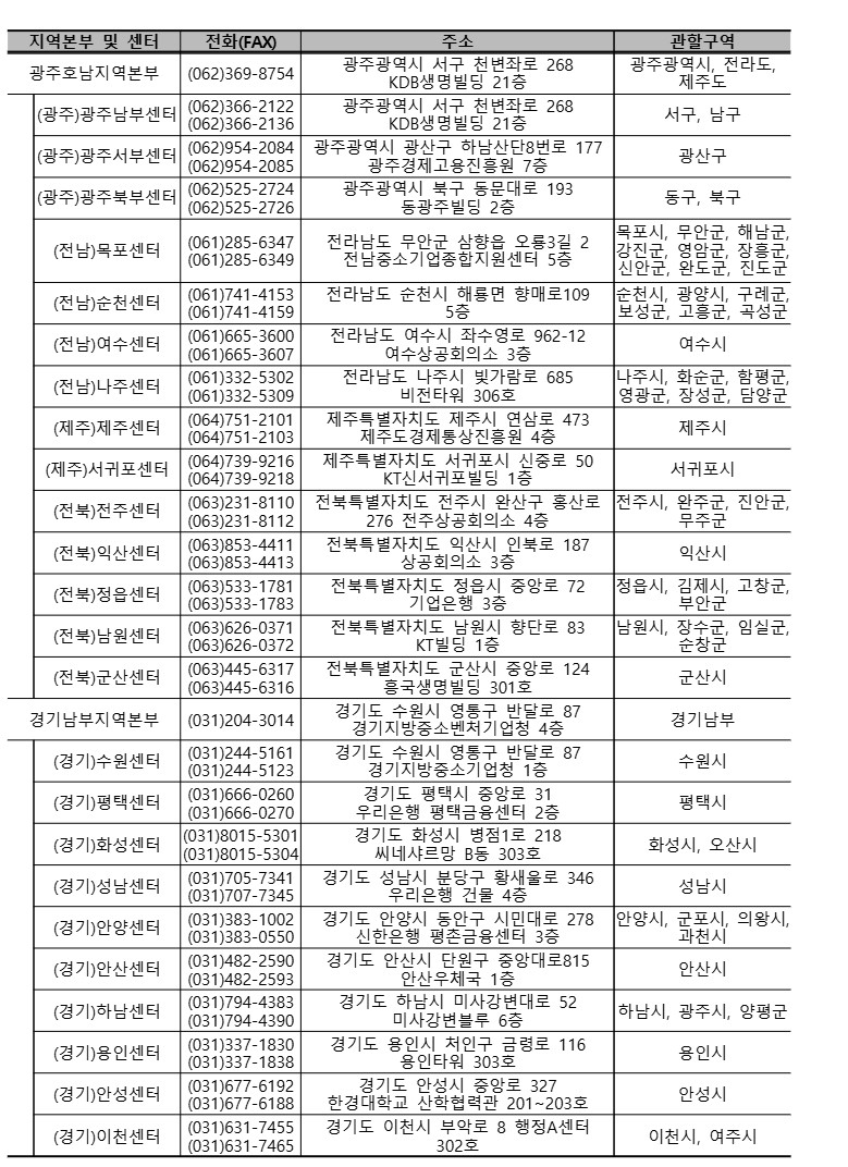 소상공인시장진흥공단 지역센터의 현황 및 연락처입니다.