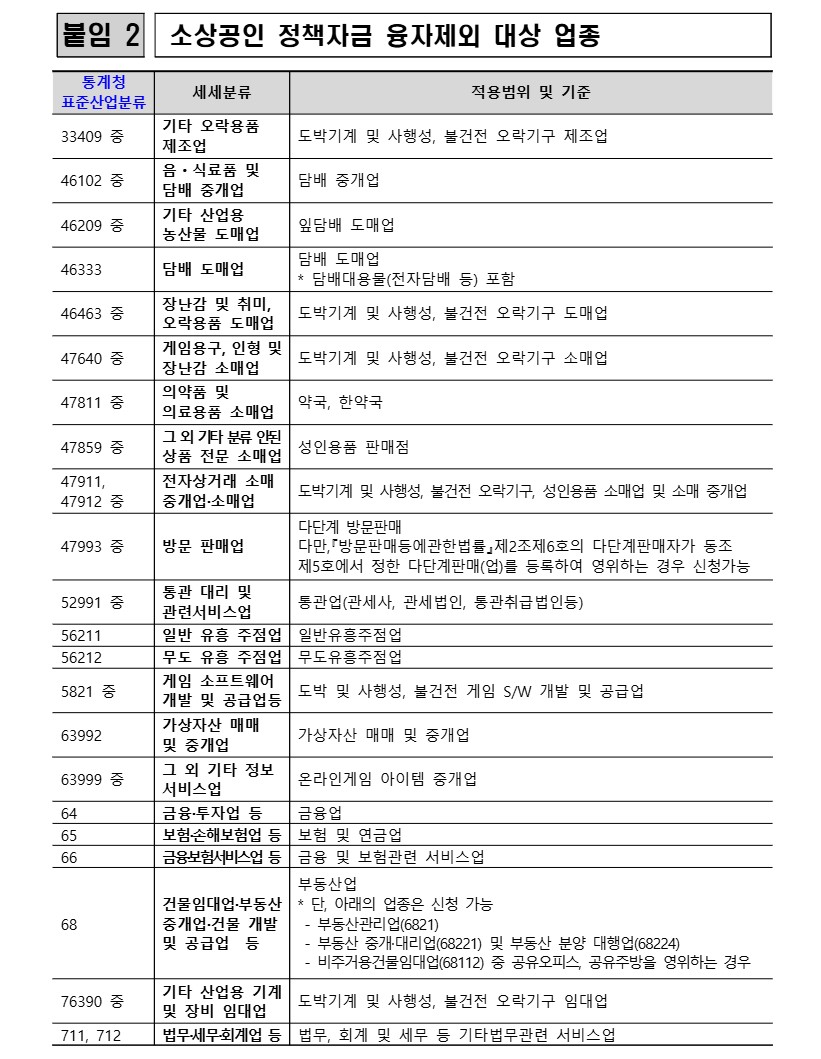 2. 정책자금 제외 대상 업종